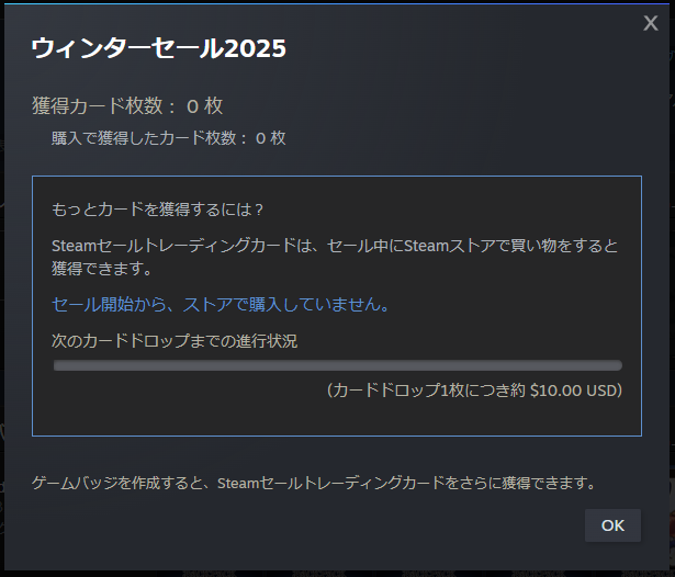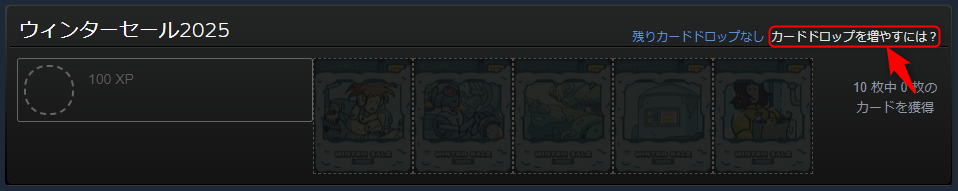 買い物の進捗状況は、バッジページの「カードドロップを増やすには?」を開くことで確認することが出来ます。