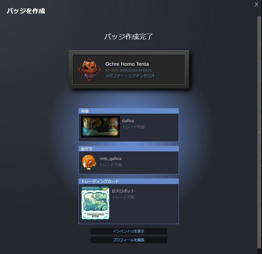 (バッジを入手すると経験値を入手することが出来て、Steamのレベルが上がります。)